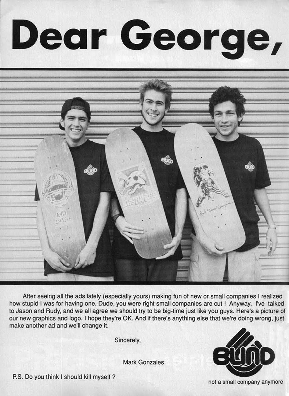 Volevamo un nome che avesse una storia da raccontare, e forse la più divertente nella storia dello skateboarding è stato il dissing tra Powell Peralta e Blind nel ‘91. Un’epoca in cui non esisteva il politically correct e le companies si facevano la guerra con adv super provocatori sugli skate mag. Per i dettagli ti rimando alla storia qui, ma quello che noi volevamo veicolare è il messaggio di come i piccoli indipendenti siano riusciti a vincere sulle big corporations, un po’ come Davide contro Golia, ed anche noi ci sentiamo un po’ così.