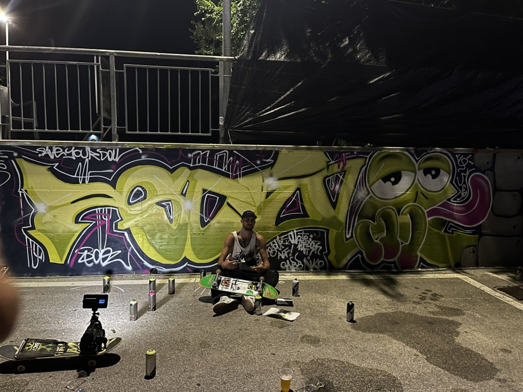 Oltre a skateare ho sempre avuto la passione per i graffiti e posso dire che le due cose sono emerse quasi di pari passo. Nel quartiere dove vivevo, zona 167 di Pomezia (RM), c’era un gruppo di ragazzi che dipingevano e facevano breakdance, erano una vera e propria B-boys crew. Il gruppo si chiamava “Saveyoursoul” che io tutt’ora quando dipingo scrivo sempre.